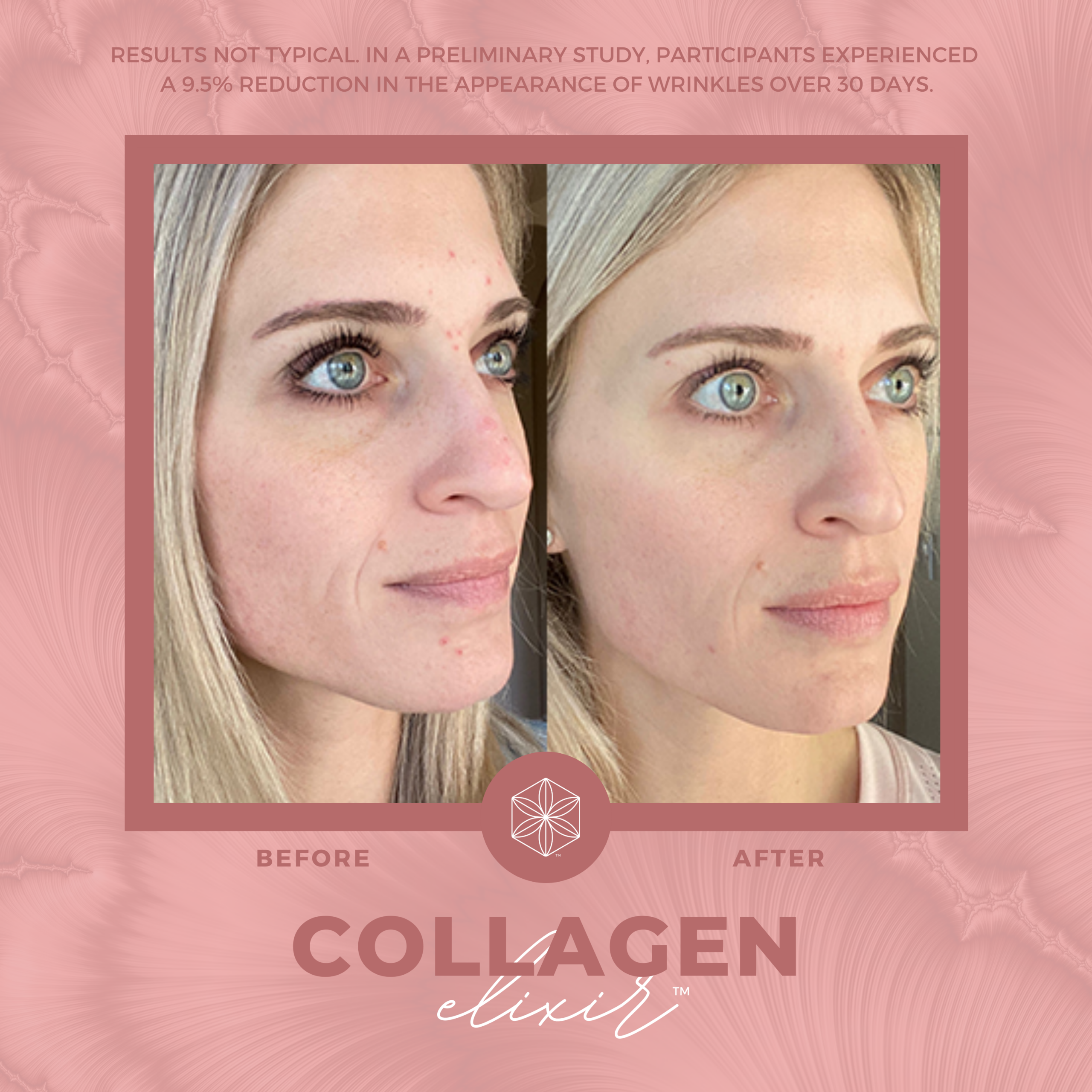 *Die dargestellten Ergebnisse sind die von Isagenix-Kunden, die Collagen Elixir zusammen mit einer Hautpflege- und ergönzenden Routine 30 Tage lang bei täglicher Anwendung verwendet haben. Die Ergebnisse sind unterschiedlich. In einer vorläufigen Studie konnten die Teilnehmer innerhalb von 30 Tagen eine Verringerung der Falten um 9,5 % feststellen.