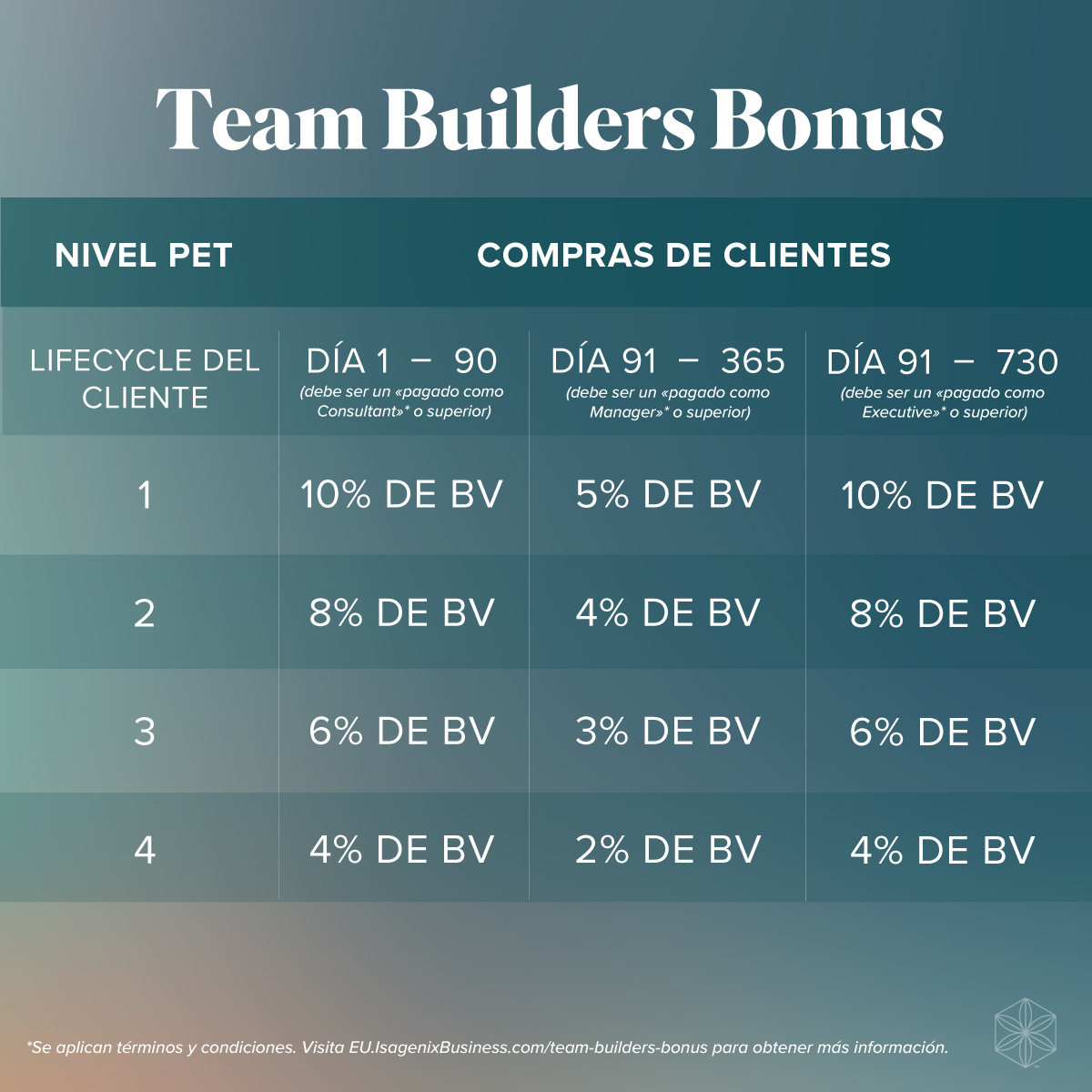 Al igual que el bienestar, las transformaciones no ocurren de la noche a la mañana. Se necesita perseverancia y dedicación. El Bono de Team Builders te permite ganar en todas las compras de los clientes hasta tu 4PET durante un máximo de 730 días desde su fecha de afiliación.
