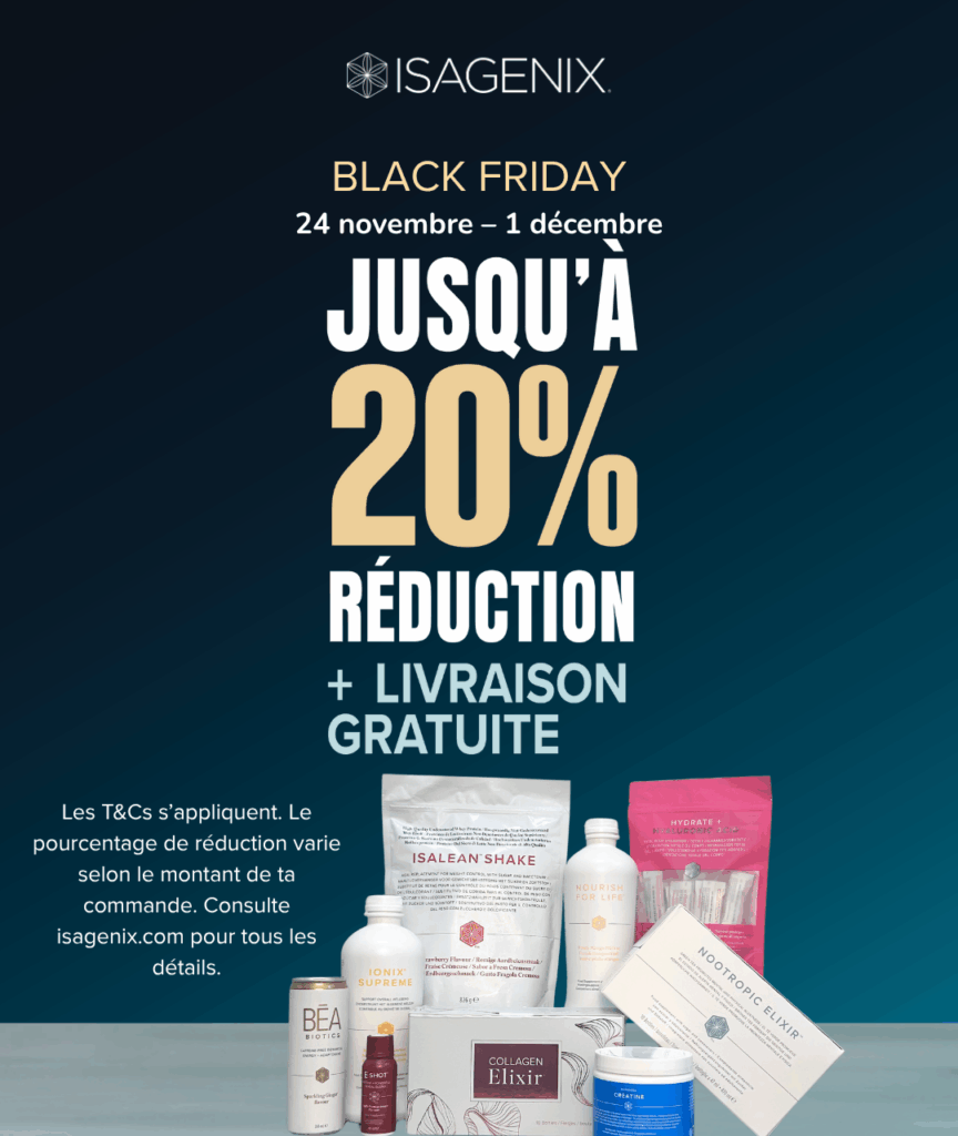 La promotion est valable du 24 novembre 2025 (00:00 US Eastern time / 05:00 GMT) au 1 décembre 2025 (23:59 US Eastern time / 2 décembre 04:59 GMT). Elle est ouverte à tous les membres, nouveaux et existants, à travers l’Europe.Pour bénéficier de la livraison gratuite, tu dois passer une commande de produits d’au moins £140/ €175.Pour obtenir 10% Off + livraison gratuite, tu dois passer une commande de produits d’au moins £180/ €225 (hors taxes).Pour obtenir 20% Off + livraison gratuite, tu dois passer une commande de produits d’au moins £220/ €275 (hors taxes).Les montants seuils n’incluent pas les frais de livraison. Les commandes Subscription Rewards doivent être traitées pendant la période promotionnelle. La réduction est automatiquement appliquée aux commandes éligibles. Le BV total sera réduit une fois la réduction appliquée. Les commandes NFR et OTG ne peuvent pas être combinées pour se qualifier.L’offre ne peut pas être utilisée avec d’autres promotions, réductions ou bons.