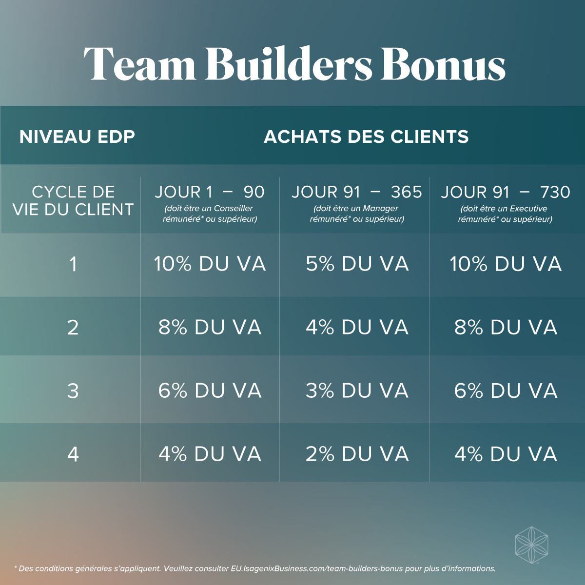 Tout comme le bien-être, les transformations ne se produisent pas du jour au lendemain. Cela demande de la persévérance et du dévouement. Le Bonus en faveur des Team Builders te permet de gagner sur tous les achats des clients jusqu’à ton 4PET pendant 730 jours à compter de leur date d’adhésion.