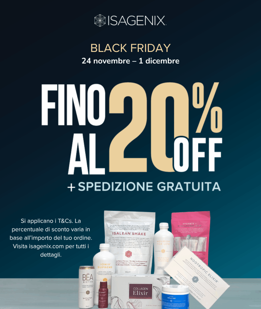 La promozione è valida dal 24 novembre 2025 (00:00 US Eastern time / 05:00 GMT) al 1 dicembre 2025 (23:59 US Eastern time / 2 dicembre 04:59 GMT). È aperta a tutti i clienti, nuovi ed esistenti, in tutta Europa.Per qualificarti per la spedizione gratuita devi effettuare un ordine di prodotti di £140/ €175 o più.Per ottenere 10% Off + Spedizione gratuita devi effettuare un ordine di prodotti di £180/ €225 (al netto delle tasse) o più.Per ottenere 20% Off +spedizione gratuita devi effettuare un ordine di prodotti di £220/ €275 (al netto delle tasse) o più.Le soglie non includono le spese di spedizione. Gli ordini Subscription Rewards devono essere elaborati durante il periodo promozionale. Lo sconto viene applicato automaticamente agli ordini idonei. Il BV totale sarà ridotto una volta applicato lo sconto. Gli ordini NFR e OTG non possono essere combinati per qualificarsi.L’offerta non può essere utilizzata insieme ad altre promozioni, sconti o voucher.