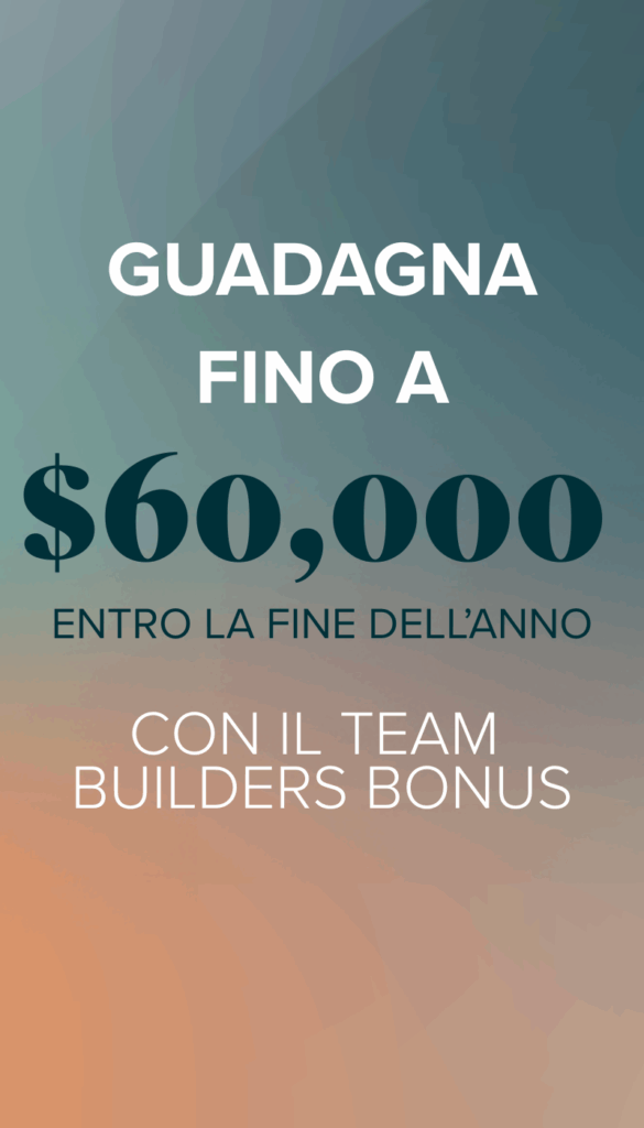 • Iscrivi 3 Membri in un mese di provvigioni e il tuo Team Builders Bonus per i giorni 1–90 raddoppierà. Se stavi guadagnando 500 $ nella fascia 1–90, ora diventano 1.000 $.