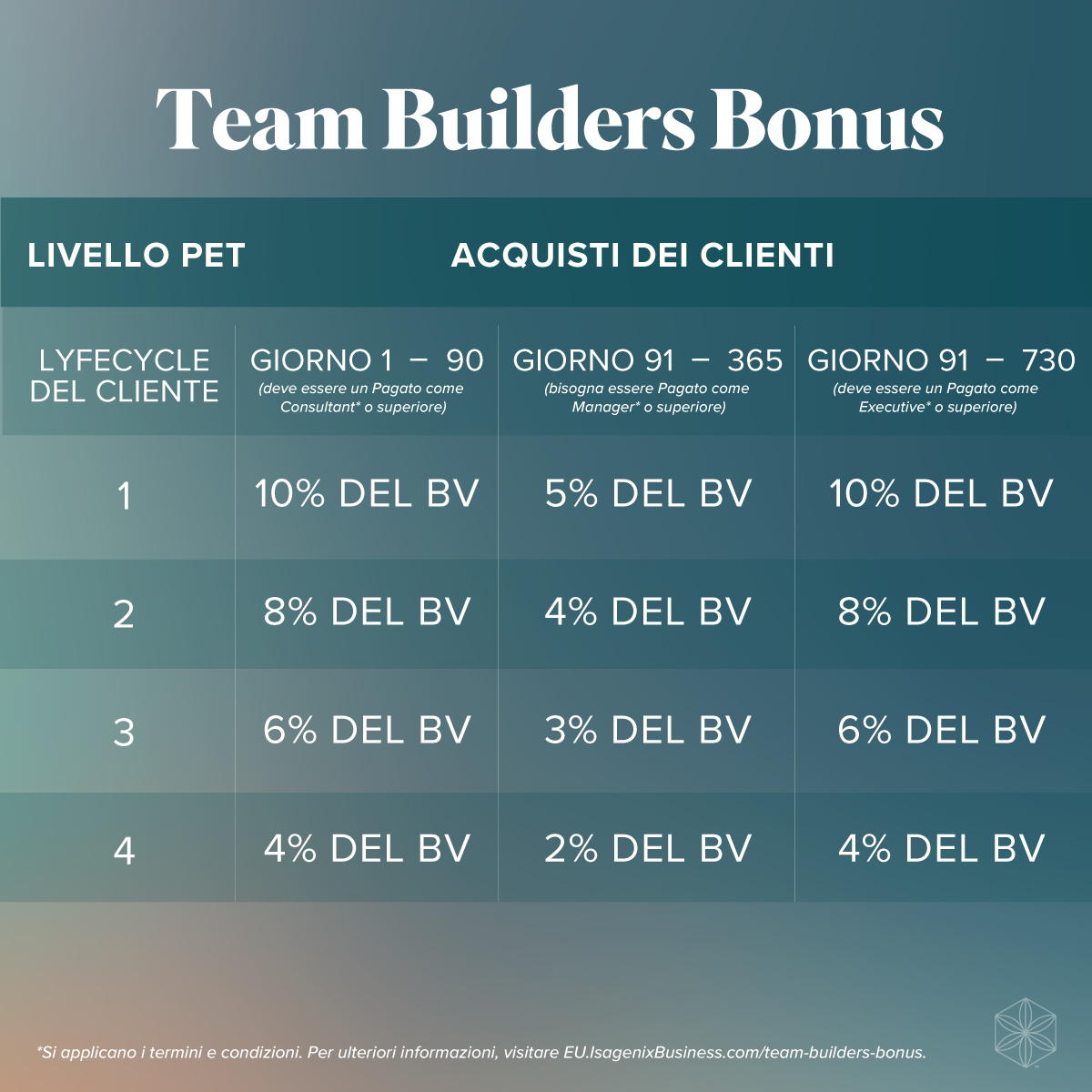 Come il benessere, le trasformazioni non avvengono dall’oggi al domani. Ci vuole perseveranza e dedizione. Il Bonus Team Builders ti permette di guadagnare su tutti gli acquisti dei clienti fino al tuo 4PET per un massimo di 730 giorni dalla data di adesione.